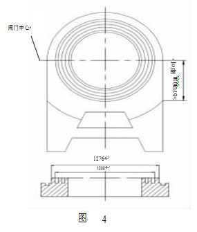 為電動(dòng)閘閥導(dǎo)軌和閥板的配合示意圖,導(dǎo)軌均為楔形結(jié)構(gòu),導(dǎo)軌與座圈組裝后,形成一帶角度的空隙,閥板導(dǎo)軌在此空隙間移動(dòng)。要求閥關(guān)閉后其閥板與閥座圈密封面的間隙平均小于 0.051mm。此閥為常開閥,正常情況下,每年關(guān)閉不超過 1 次,關(guān)閉時(shí),一方面靠流通介質(zhì)的力量使閥板與座圈貼緊,另一方面,通過閥板楔入,使閥板與座圈的密封面貼緊,從而達(dá)到密封的目的。 該閥門的開關(guān)行程為 1300mm,理論上座圈導(dǎo)軌的工作長度是 1300mm(從閥門中心起),實(shí)際上座圈導(dǎo)軌除閥門通道口受流通介質(zhì)沖蝕外,其余部分只起導(dǎo)向作用,所以我們可以在滿足工況要求的前提下將座圈導(dǎo)軌的堆焊部位縮短,使其長度大于環(huán)形密封面口徑的一半 670mm (從閥門中心起)即可。 考慮以上原因,我們調(diào)整加工工藝為:粗車平面及環(huán)形堆焊槽,粗車導(dǎo)軌堆焊部位(粗車圖如圖 4),劃導(dǎo)軌堆焊位置線,堆焊,熱,校平,精車環(huán)形密封面,精刨導(dǎo)軌,在粗加工階段為盡量增大工件的剛性,同時(shí)減少工序周轉(zhuǎn),座圈尾部先不加工,精加工完環(huán)形密封圈及導(dǎo)軌后,在導(dǎo)軌與環(huán)形密封面夾縫處仍有大量毛坯高出密封面及導(dǎo)軌,須將其去除,我 們采用銑加工。